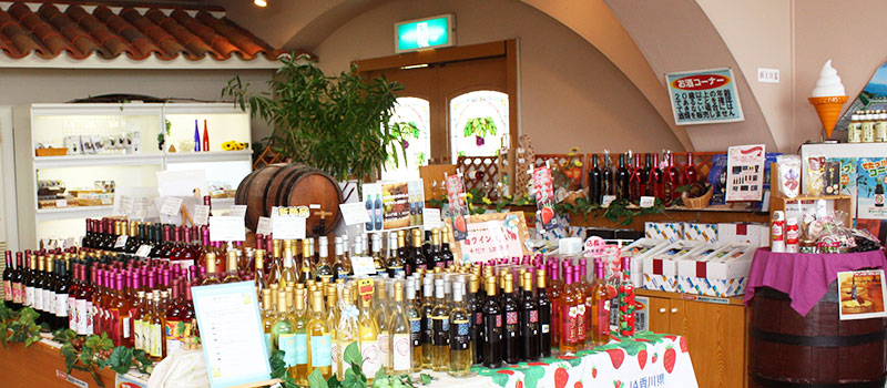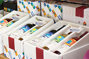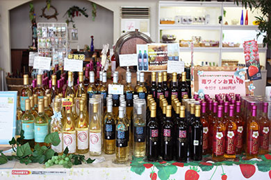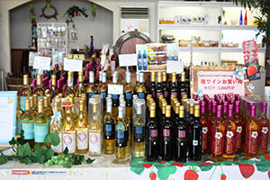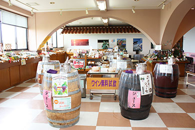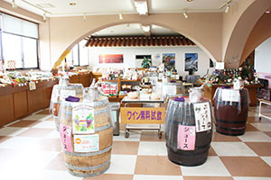 工場隣接ワイナリーショップ1F直売コーナーでは新鮮なワインのほか、おみやげものや、地元名産品なども多数取り揃えております。 ※ワイナリーで作られたワインやジュースの試飲コーナーもご用意しています。